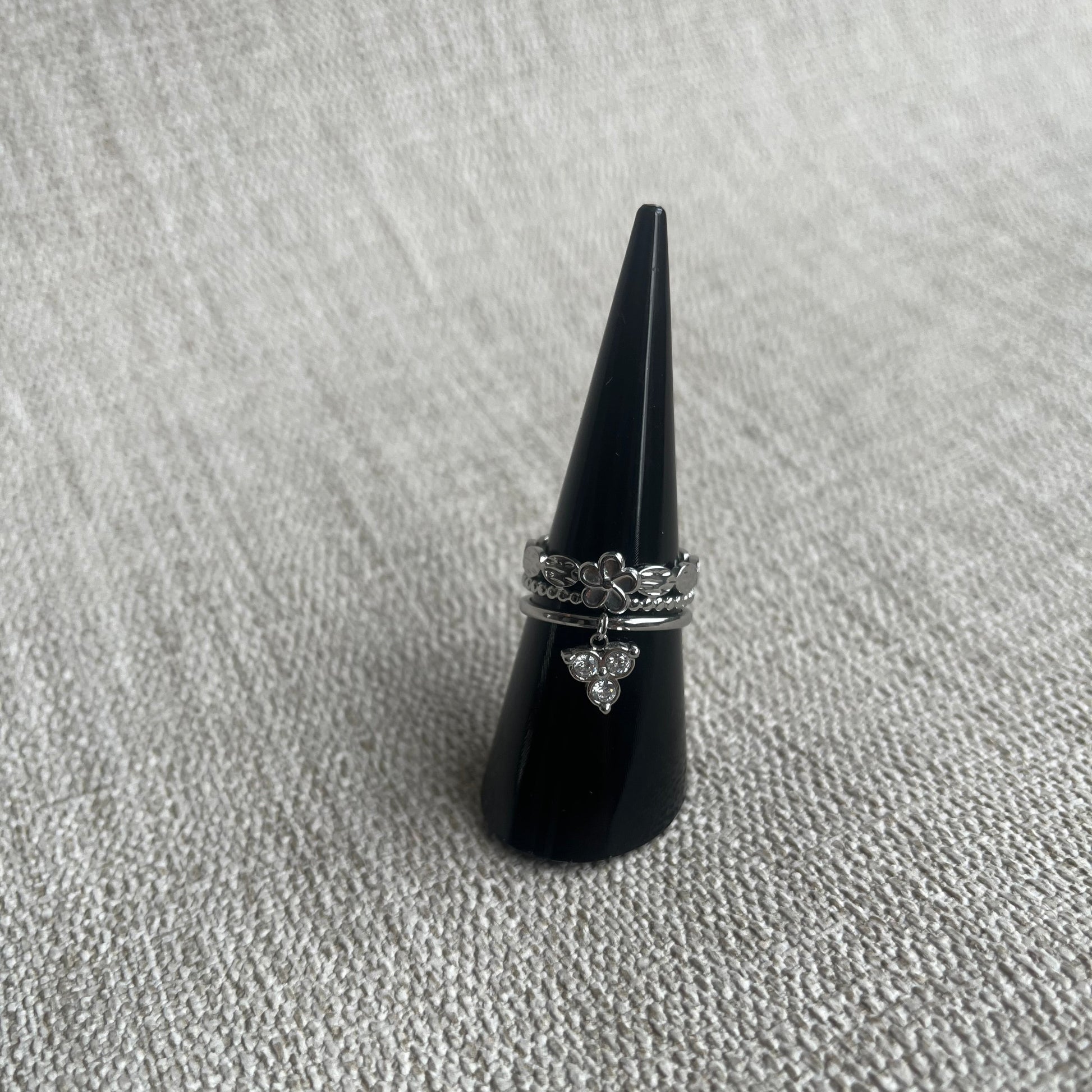 Découvrez la bague argenté Lucky Flower en acier inoxydable 304, avec son effet triple bague sa fleur et sa breloque trèfle. Parfait pour un usage quotidien, cette bague résistante à l’eau s’adapte à tous vos styles.