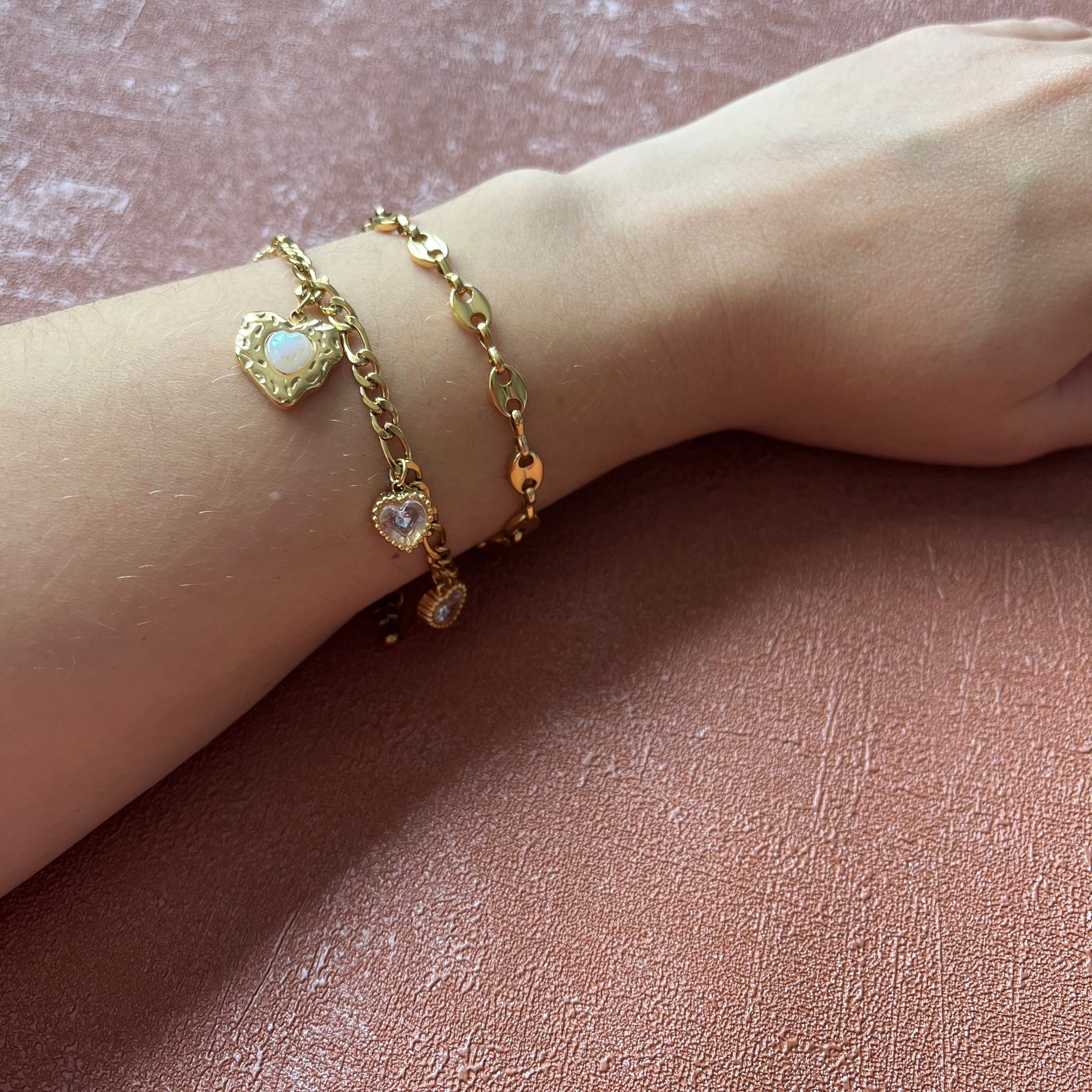 Découvrez le bracelet doré Perle en acier inoxydable 304, composé de deux chaines et de breloques coeurs. Parfait pour un usage quotidien, ce bracelet résistant à l’eau s’adapte à tous vos styles.