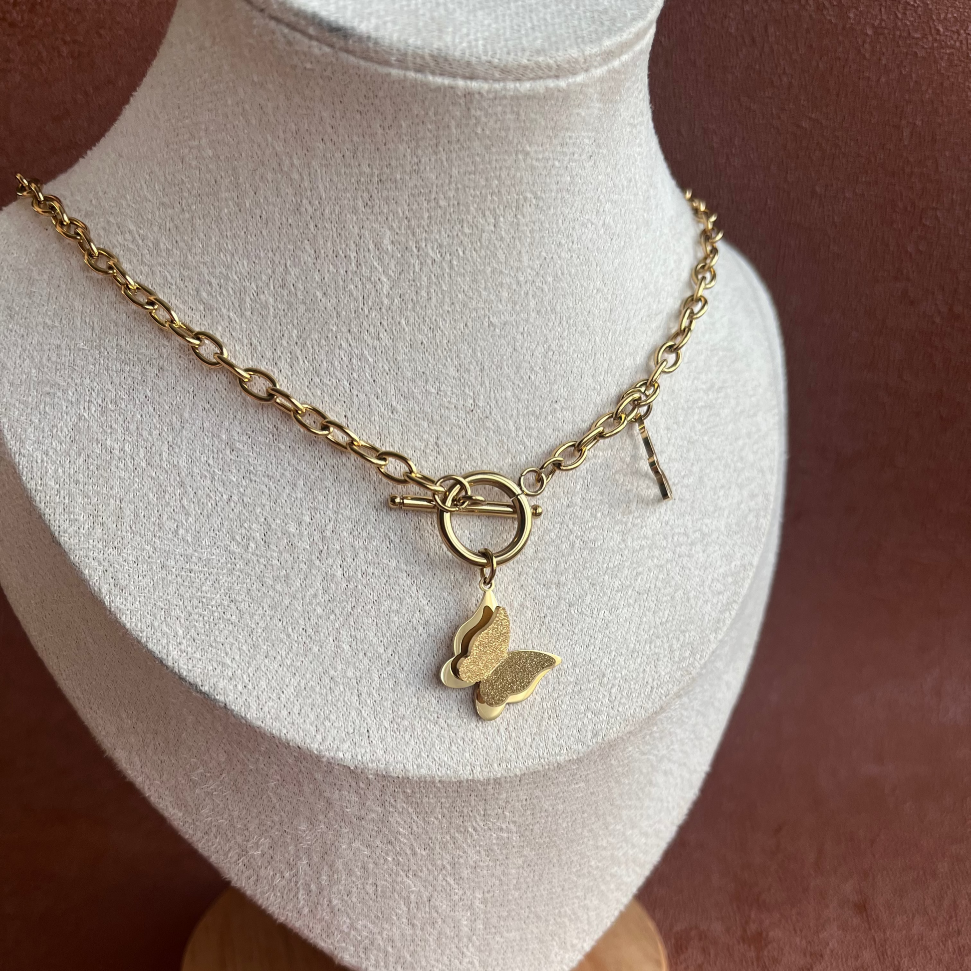 Découvrez le collier doré Butterfly en acier inoxydable 316, un collier avec un fermoir au centre avec deux papillons . Parfait pour un usage quotidien, ce collier résistant à l’eau s’adapte à tous vos styles.