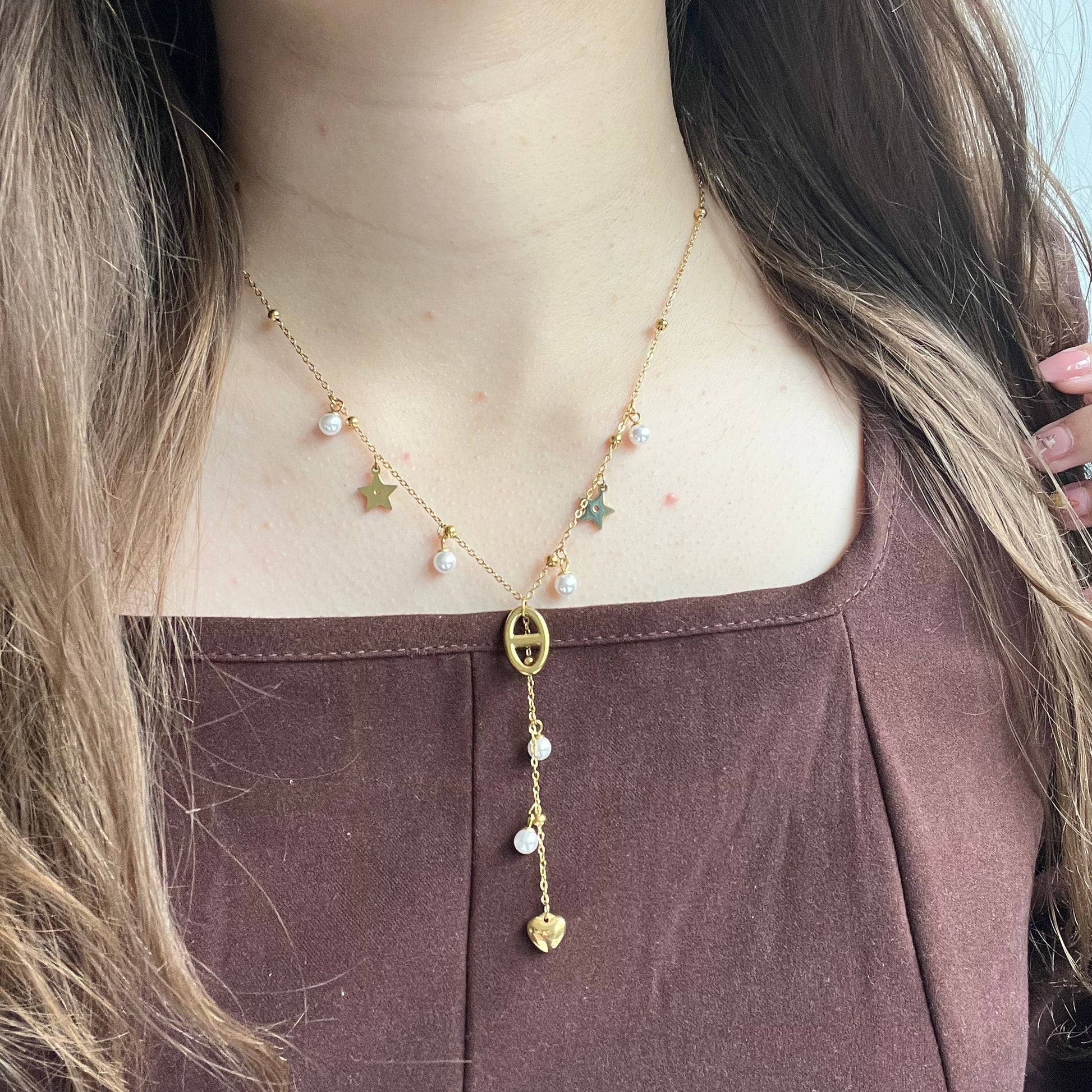 Découvrez le collier dorée Farandole en acier inoxydable 304, un collier en Y avec ses multiples breloques. Parfait pour un usage quotidien, ce collier résistant à l’eau s’adapte à tous vos styles.