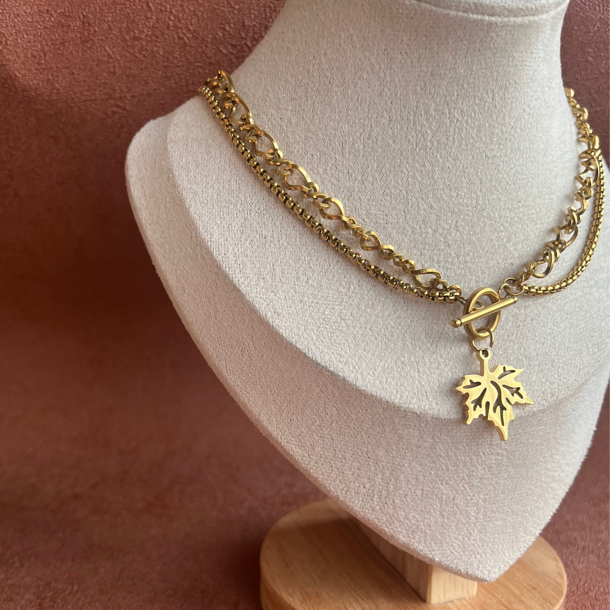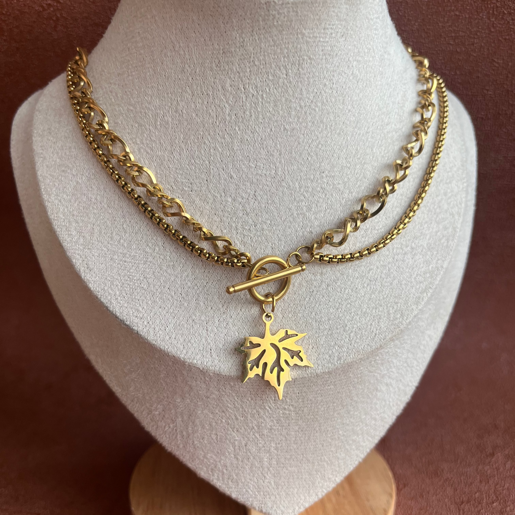 • Design double chaine avec fermoir central et feuille automne