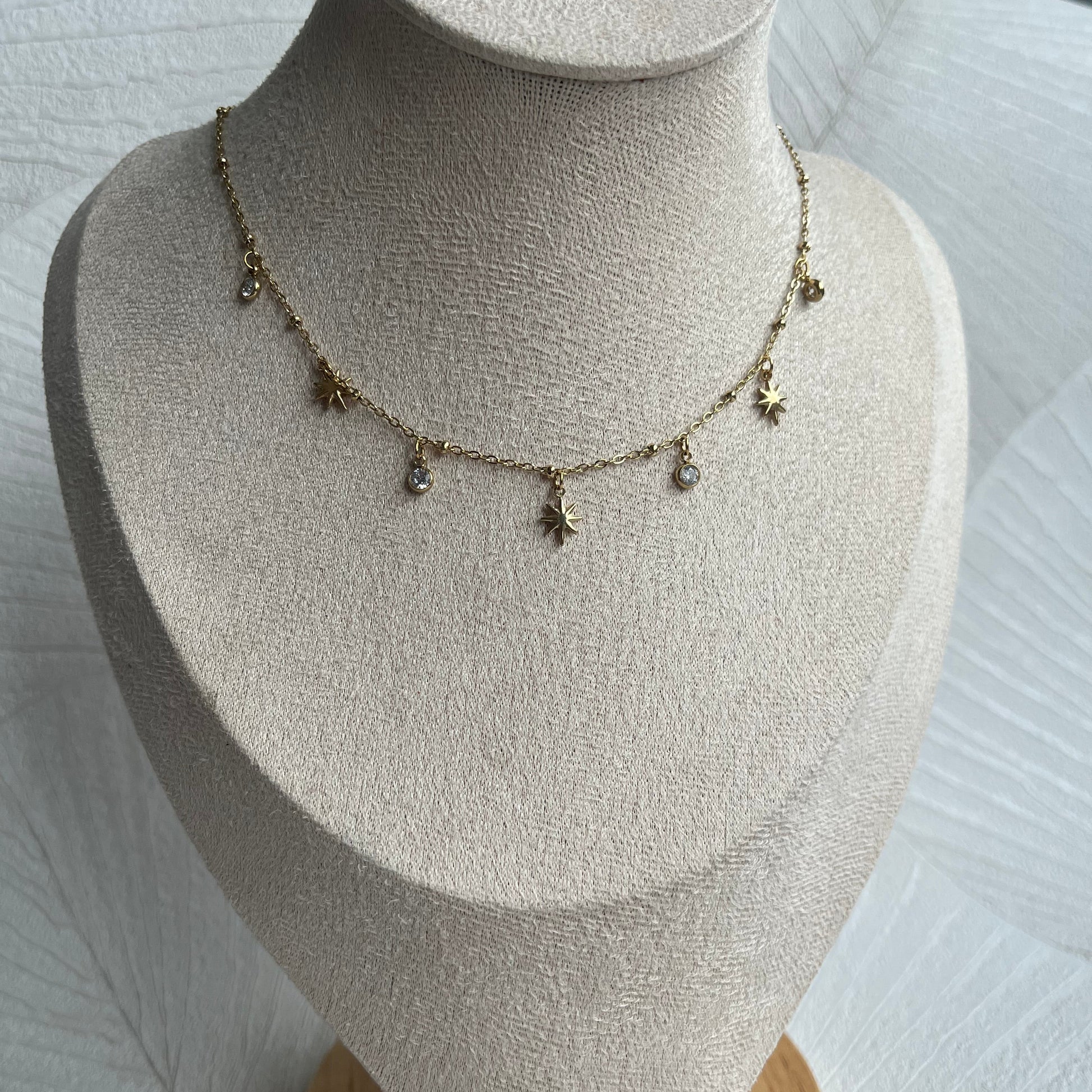 Le collier Pluie d’étoiles est en acier inoxydable, un matériau durable qui ne noircit pas et résiste à l’eau.